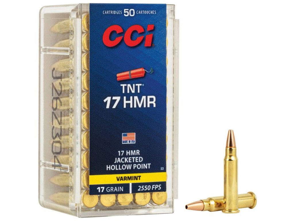 Malokalibrové strelivo CCI .17 HMR TNT JHP s hmotnosťou strely 1,10 g (17 gr) a presnou úsťovou rýchlosťou 777 m/s, balenie 50 ks. Vysokorýchlostná munícia s expanznou strelou určená pre maximálny účinok a presnosť.