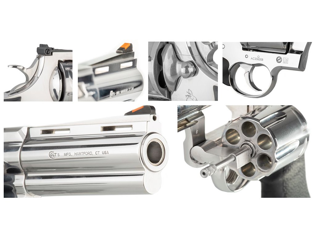 COLT Anaconda .44 Magnum, 6" Barrel je robustný revolver s oceľovým rámom a kvalitnou povrchovou úpravou. V kombinýcii so 6" hlavňou poskytuje presnú a stabilnú streľbu pri nižšom spätnom ráze.