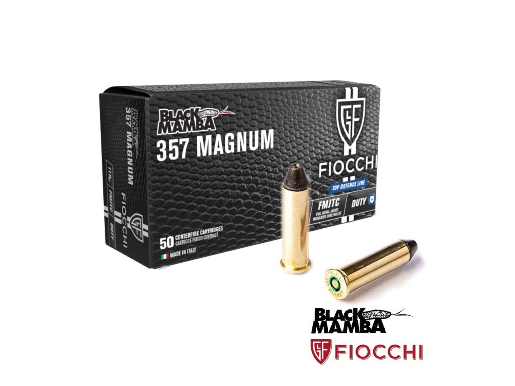 Revolverové strelivo Fiocchi .357 Magnum Black Mamba FMJTC 110 gr (7,13 g) patrí do série Top Defence Black Mamba a je osadené celoplášťovou streľou typu FMJTC (Full Metal Jacket Truncated Cone). Vďaka nízkej hmotnosti strely dosahuje veľmi vysokú úsťovú rýchlosť a energiu, čo zabezpečuje spoľahlivý výkon a presnosť pri športovej streľbe alebo obrannom použití. Balenie obsahuje 50 nábojov.