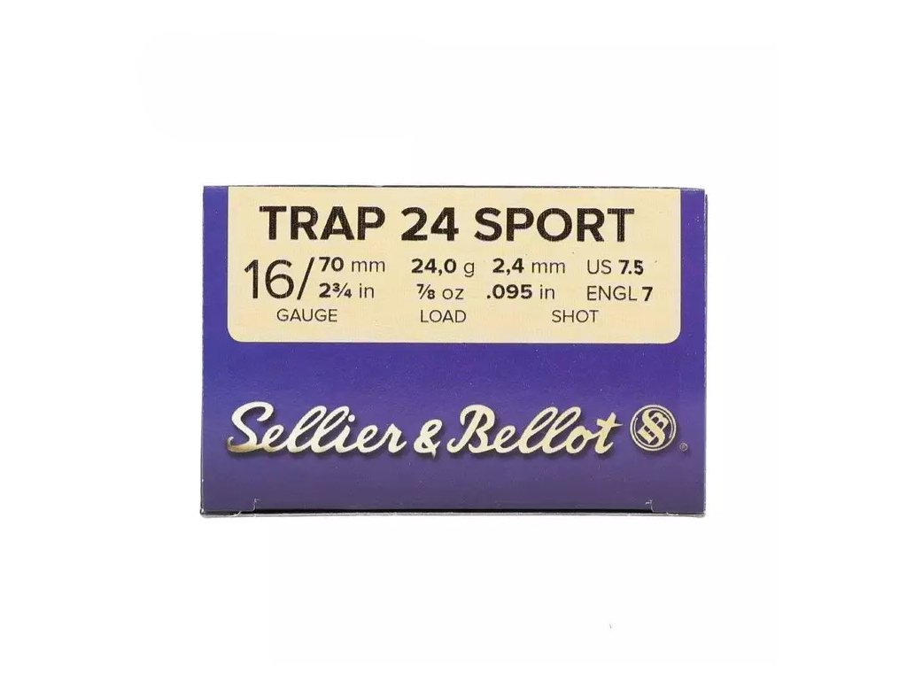 Brokové strelivo Sellier & Bellot 16/70 Trap Sport s brokom 2,4 mm, navážkou 24 g a presnou úsťovou rýchlosťou 395 m/s, balenie 25 ks. Určené pre trapovú a športovú brokovú streľbu v kalibri 16.